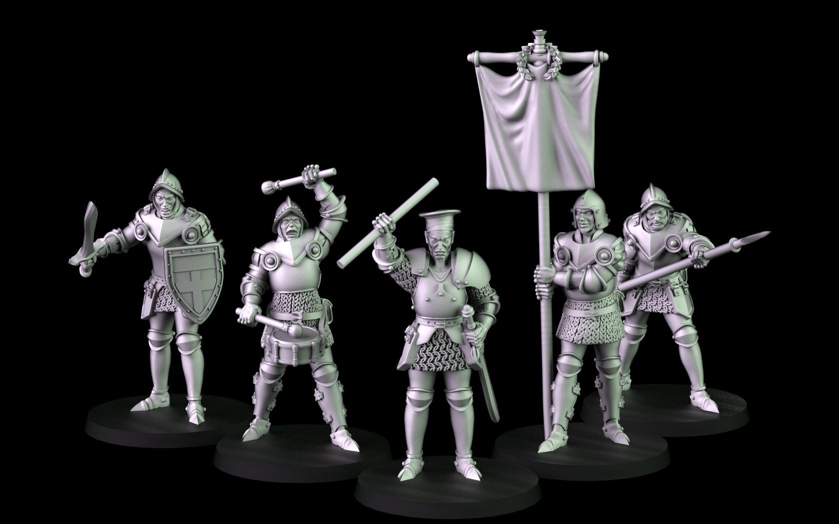 Five City Guard miniatures, perfect for soldier/fighter player characters, guards, knights, soldiers, or evil minions.