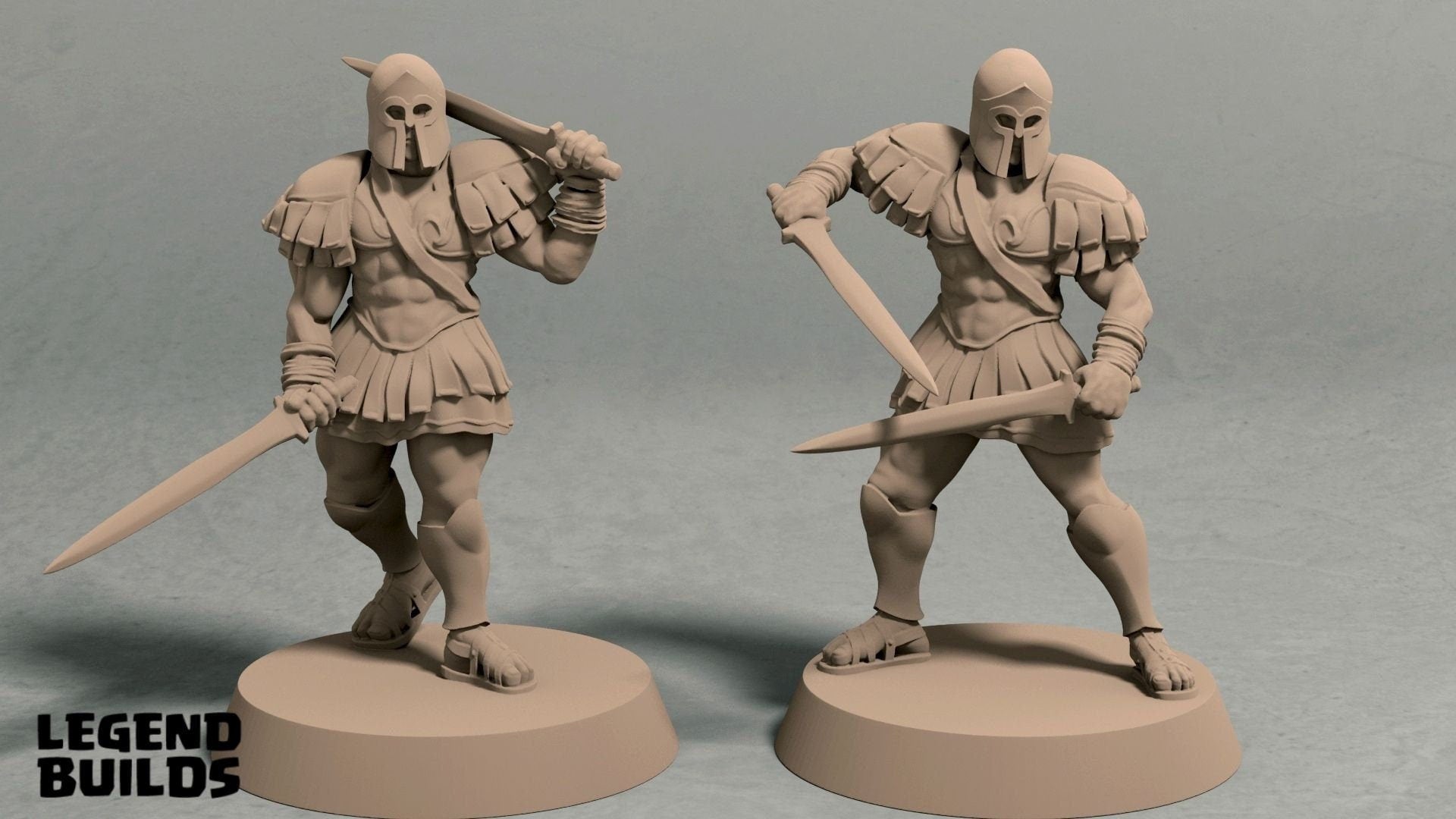 A dual-wielding human male miniature. Based on Roman Legionnaires, it can be used as a Fighter, Paladin, or Barbarian player character, city guard, NPC, etc.